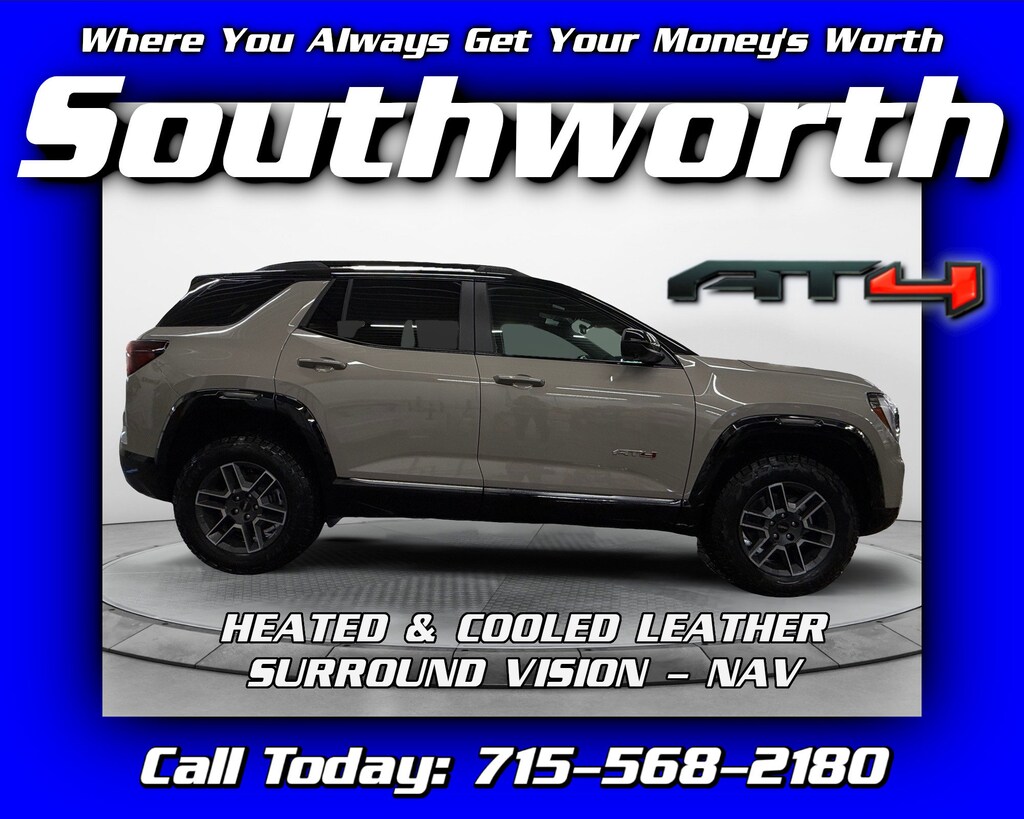 Southworth Chevrolet GMC is the Best Dealership to buy a New 2026 GMC Terrain AWD AT4!Southworth Chevrolet GMC is your premier new and used dealership in Bloomer, Wisconsin. Serving the Chippewa Valley and surrounding areas like Eau Claire, Chippewa Falls, Rice Lake and Menomonie since 1955. For 70 years, a third-generation family owned and run business, we have strived to offer our customers great values with that small town appeal, with a low-pressure atmosphere, friendly service and familiar faces.Not only do we offer all models of new Chevrolets and GMCs, we also have a great variety of used vehicles of all makes and models. Search through all our cars, trucks and SUVs to find the best fit for you. Paired with our dedication and exceptional customer service, we are certain we can help you find a vehicle you will enjoy driving. We are a one stop shop, including in-house financing, DMV licensing and warranty experts. We are here to serve you with our Service and Parts Department to help you with all your vehicle's needs after your purchase.