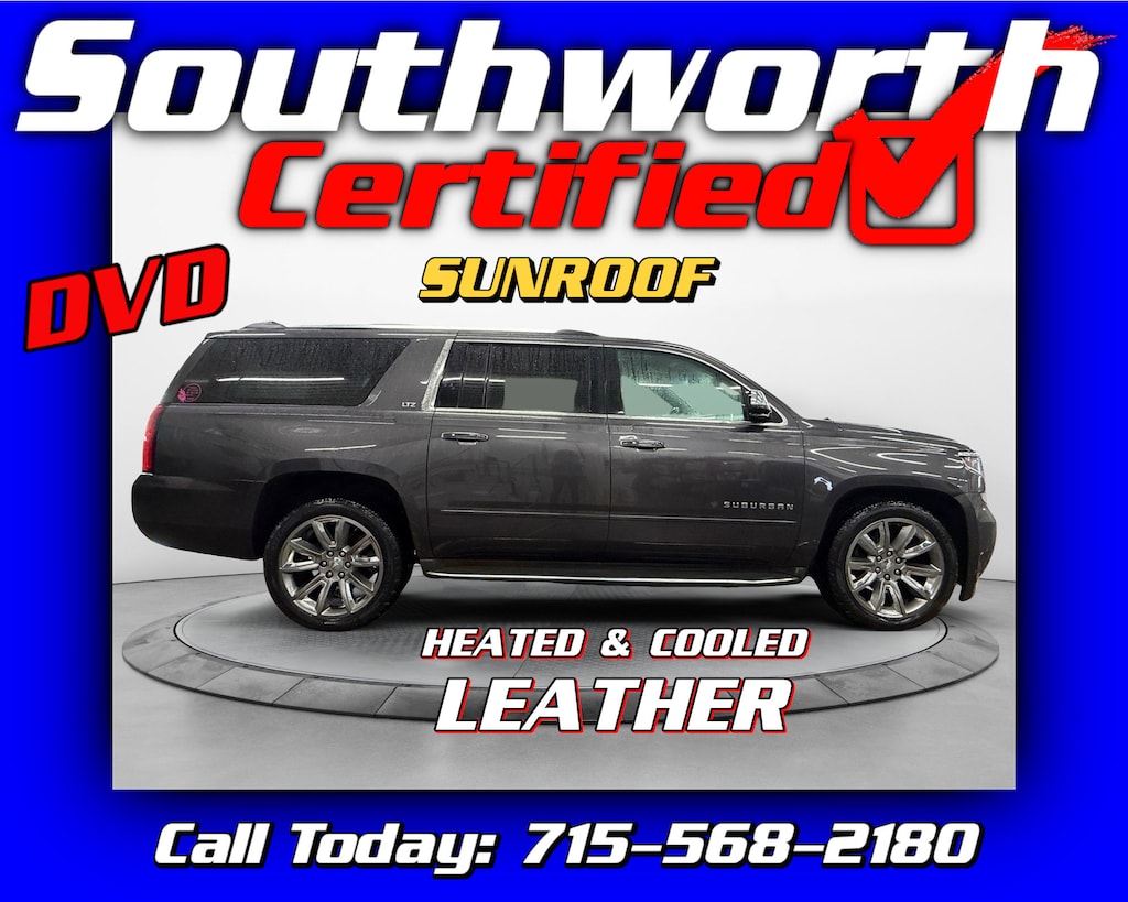 This 2016 Chevrolet Suburban LTZ is a well-equipped local trade powered by a strong 5.3L V8 gas/ethanol engine and four-wheel drive, offering the space, capability, and comfort your family needs. Inside, you'll find heated and cooled leather seats, second-row bucket seats, seating for seven, dual DVD players, a sunroof, and power-folding third-row seats for added convenience. It also features passive entry, remote start, and advanced safety technology including forward collision alert, lane keep assist, and blind zone alert. This Suburban has completed our Southworth Certified inspection, received a full professional detail, and comes with a fresh oil change, so it's ready for the road. Call today to schedule your test drive at 715-568-2180.