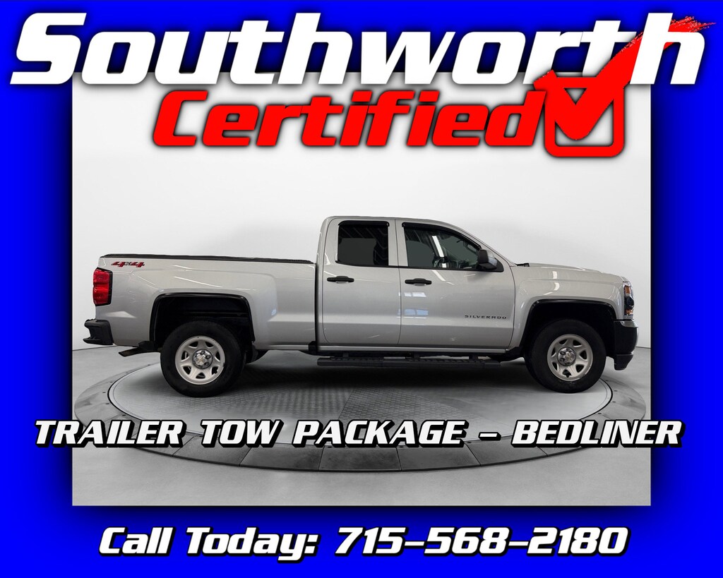 This 2018 Chevrolet Silverado 1500 Work Truck is a dependable and capable pickup powered by a 5.3L V8 with four-wheel drive, making it well suited for work or everyday driving. It has a clean Carfax and is a one local owner vehicle, showing it has been well cared for. Equipped with a tow package with trailer brake controller, sprayed-in bedliner, and bed cover, this truck is ready to haul and tow with confidence. Additional features include cruise control for highway comfort. It has completed a Southworth Certified Inspection, received a fresh oil change, and a complete professional detail, so it's fully serviced and ready for its next owner. Call us today to come see it at 715-568-2180.