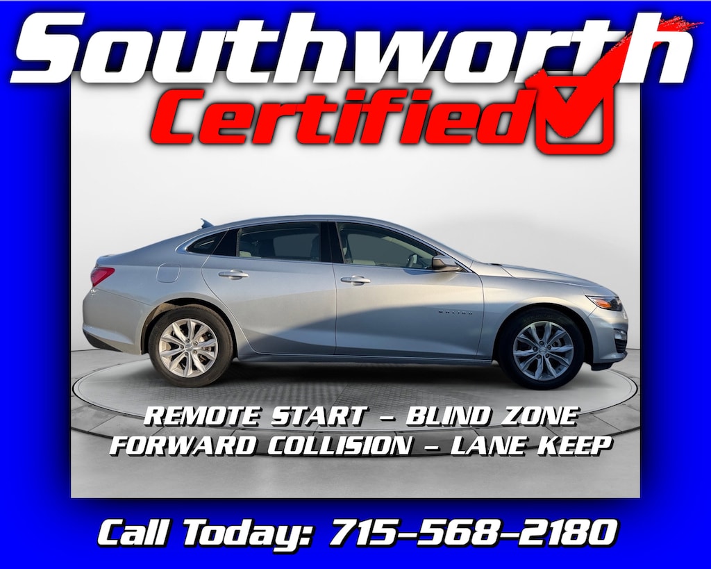 It comes equipped with convenient features like passive entry, remote start, and heated seats, as well as modern technology including Apple CarPlay and Android Auto. Safety is enhanced with Forward Collision Alert, Lane Keep Assist, and Blind Zone Alert for added peace of mind. This Malibu has completed a Southworth Certified inspection, received a fresh oil change, and undergone a full professional detail, making it ready for its next owner. Call 715-568-2180 today to schedule your test drive.