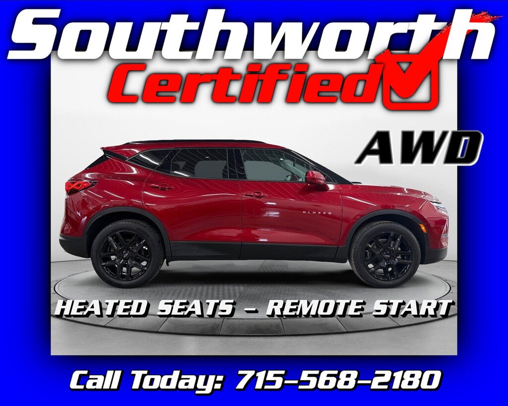 This 2023 Chevrolet Blazer LT is a one-owner SUV with a Clean Carfax, offering sporty styling and confident performance thanks to its 3.6L V6 engine and all-wheel drive. It's equipped with modern safety features including forward collision alert and lane keep assist, along with convenient comforts like remote start. The bold look is enhanced by 20-inch wheels, giving it a strong road presence. This Blazer has passed a Southworth Certified Inspection, received a fresh oil change, and been professionally detailed, making it fully ready for its next owner. Call us today to come see it in person at 715-568-2180.