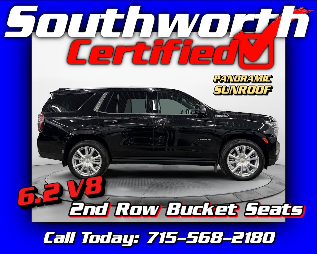 This 2023 Chevy Tahoe High Country is a premium full-size SUV that blends luxury, power, and capability, featuring four-wheel drive and a commanding 6.2L V8 for confident performance in all conditions. The upscale interior includes second-row captain's chairs, heated and cooled leather seating, a panoramic sunroof, head-up display, and intuitive navigation, creating a refined and comfortable driving experience. Advanced technology and safety features such as surround vision, forward collision alert, lane keep assist, blind zone monitoring, and passive entry add confidence and convenience on every drive. Equipped with a tow package, this Tahoe is ready for work or recreation. It comes with a clean Carfax, has passed a Southworth Certified inspection, received a complete professional detail, and includes a fresh oil change, making it fully serviced, exceptionally clean, and ready for its next owner. Call today to schedule your test drive at 715-568-2180.