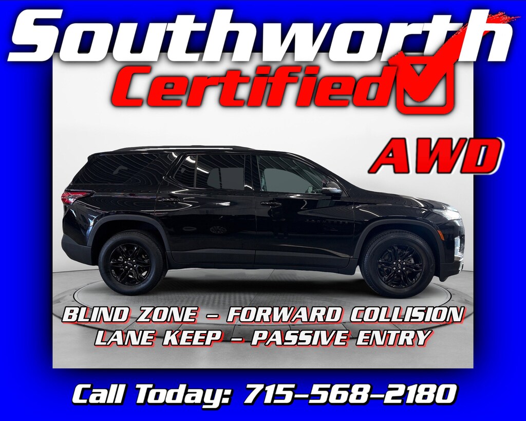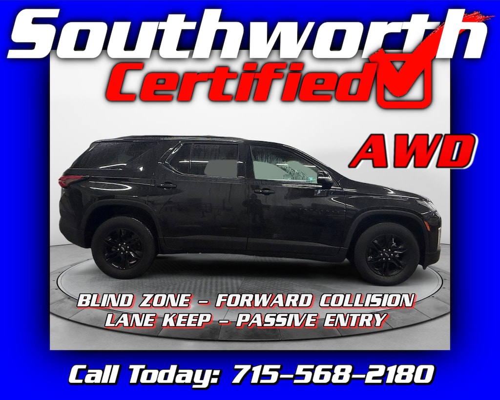 This 2023 Chevrolet Traverse LT Leather AWD is a one-owner, Clean Carfax SUV powered by a 3.6L V6 DOHC 24V engine, offering smooth performance and all-weather confidence. With just over 20,000 miles, it provides spacious 7-passenger seating with second-row bucket seats, along with premium comfort features including heated seats and a heated steering wheel. Safety and convenience are enhanced with forward collision alert, lane keep assist, blind zone monitoring, and remote start. This Traverse has completed a Southworth Certified Inspection, received a fresh oil change, and undergone a complete professional detail, making it ready for your family's next adventure. Call us today to come see it at 715-568-2180.