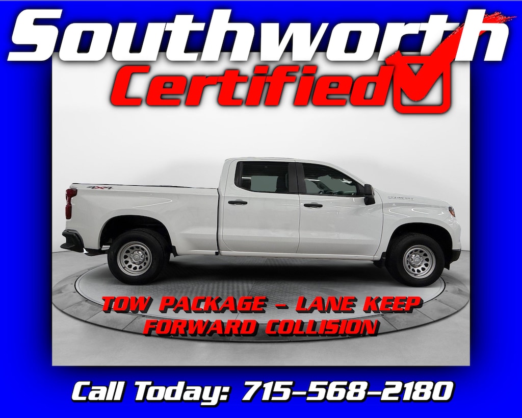 This 2024 Chevy Silverado 1500 Work Truck comes with a clean Carfax and is powered by the dependable 5.3L V8 paired with four-wheel drive, making it ready to handle tough jobs in any season. It's equipped with a poly bedliner and tow package to get the job done, along with forward collision alert and lane keep assist for added confidence on the road. Inside, you'll find Apple CarPlay, Android Auto, A/C, and power windows and locks for everyday comfort and convenience. This Silverado has passed a Southworth Certified inspection, received a complete professional detail, and comes with a fresh oil change. Call today to schedule your test drive at 715-568-2180.