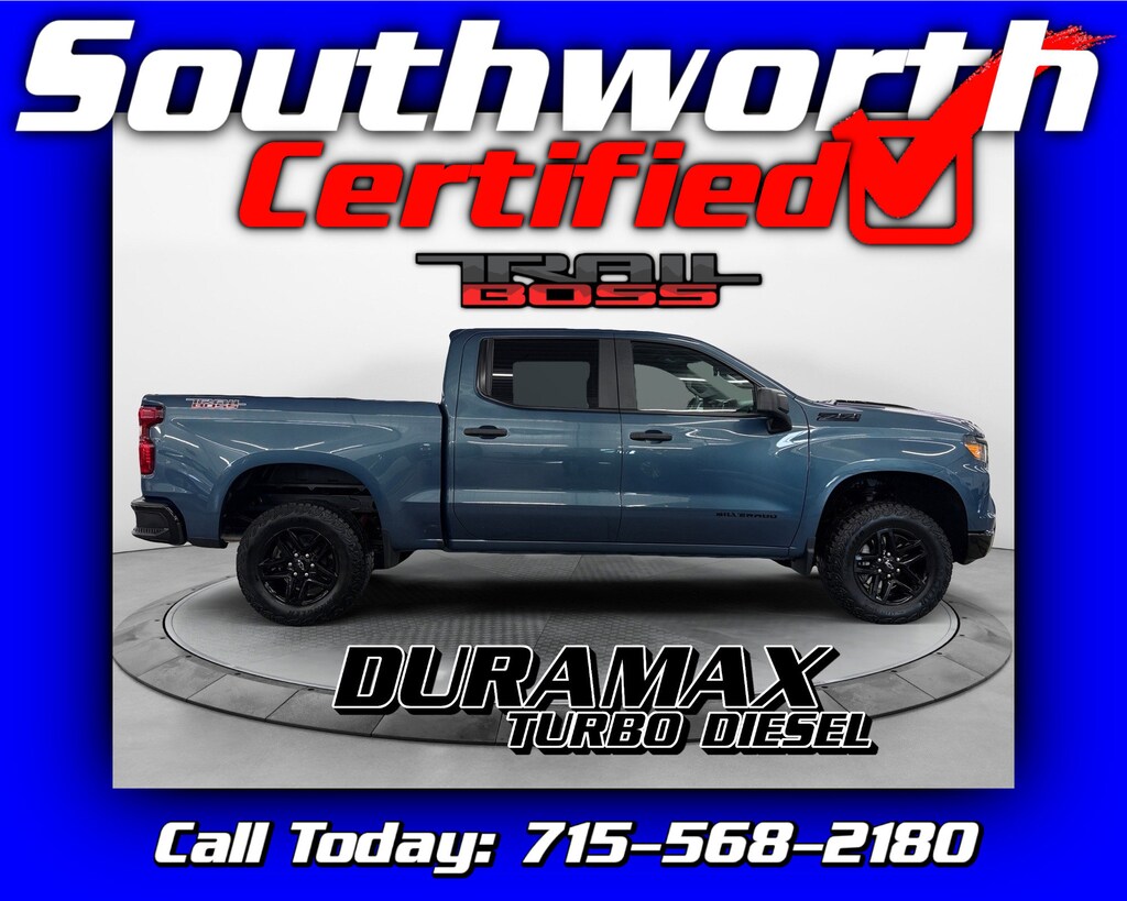 Check out this Chevy Silverado 1500 Custom Trail Boss powered by the impressive 3.0L I6 Duramax turbo diesel and equipped with four wheel drive for confident performance in any condition. This truck is a one local owner vehicle with a clean Carfax, giving you added peace of mind. It comes well equipped with forward collision alert, lane keep assist, tow package with trailer brake controller, remote start, Apple CarPlay, and Android Auto. It has completed a Southworth Certified inspection, received a complete professional detail, and just had a fresh oil change. This Silverado is ready to hit the road --- call today to schedule your test drive at 715-568-2180!
