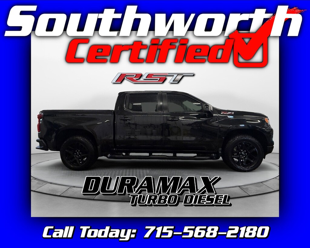 This 2024 Chevrolet Silverado 1500 RST is a powerful and well-equipped pickup featuring the 3.0L inline-six Duramax turbo diesel engine paired with four-wheel drive, delivering impressive performance, efficiency, and towing capability. This one-owner truck comes with a clean CARFAX and is loaded with premium features, including a bed cover and bed liner for added protection and convenience. The Z71 Off-Road Package and bold 20" aluminum wheels give it a rugged, confident look, while trailering is made easy with an integrated trailer brake controller. Inside, you'll enjoy heated seats and a heated steering wheel, a premium Bose sound system, remote start, and advanced safety technology such as forward collision alert and lane keep assist. This Silverado has completed a Southworth Certified inspection, has been fully professionally detailed, and just received a fresh oil change, making it truly turn-key and ready to go. Call today to schedule your test drive at 715-568-2180.