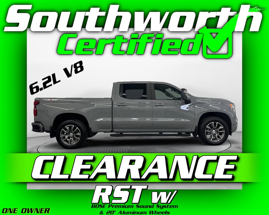 Drive in power and style with this 2025 Chevrolet Silverado 1500 RST, featuring a robust 6.2L V8 engine and four-wheel drive for confident handling in any condition. This one-owner, clean CARFAX truck is equipped with advanced safety features like forward collision alert and lane keep assist, keeping you protected on the road. Inside, enjoy comfort all year round with heated front seats and steering wheel, plus built-in navigation to keep you on course. A spray-in bedliner adds durability for all your hauling needs. Fully inspected through the Southworth Certified Inspection, this Silverado also comes with a fresh oil change and complete professional detail. Don't miss your chance to own this powerful and well-equipped truck---call us today at 715-568-2180 to schedule your test drive!