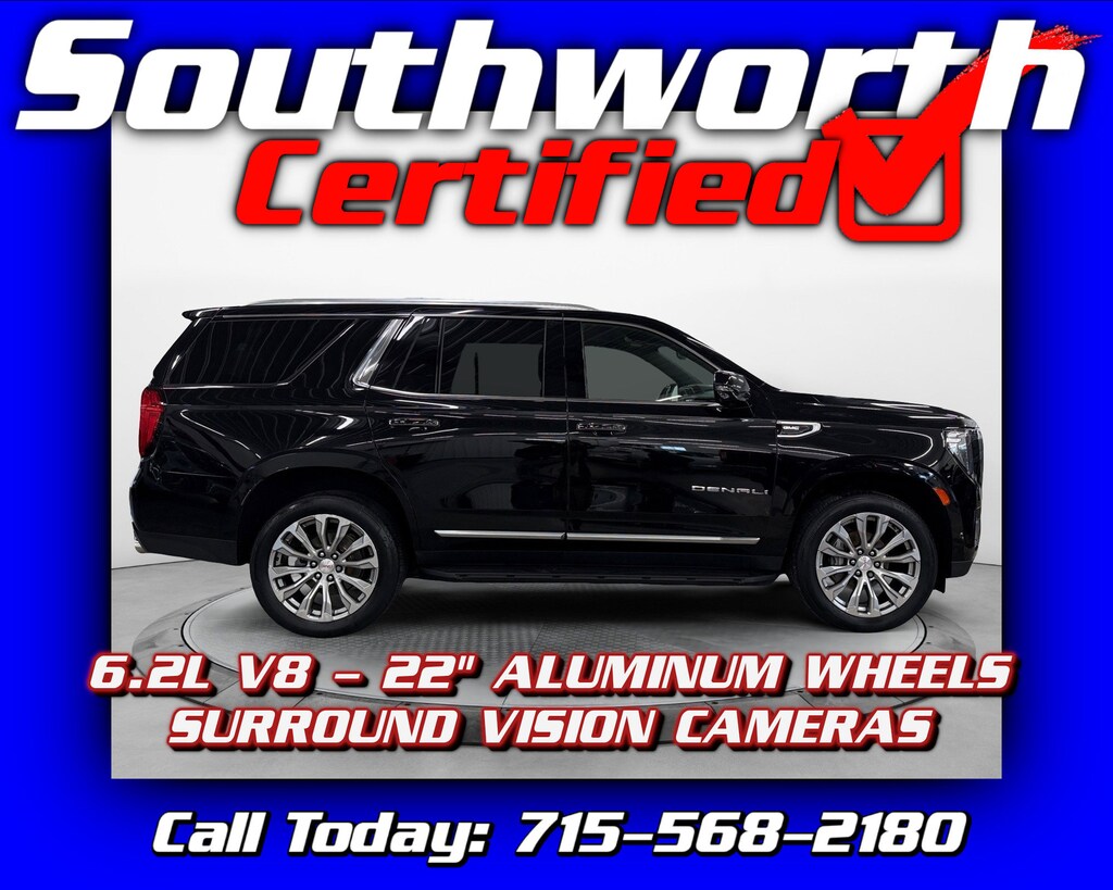 For sale is a 2021 GMC Yukon Denali with a powerful 6.2L V8 engine and four-wheel drive, perfect for Wisconsin weather and any terrain. This one-owner vehicle comes with a clean Carfax and has passed the Southworth Certified Inspection, ensuring it's in excellent condition. Inside, you'll find luxurious features like heated and cooled leather seats, second-row captain's chairs for added comfort, 7-passenger seating, a panoramic sunroof, and a premium Bose sound system. Advanced safety features include forward collision warning and lane keep assist for added peace of mind. It has just received a fresh oil change and a complete professional detail, making it road-ready and showroom-clean. If you're looking for a full-size SUV that combines performance, luxury, and safety, this Yukon Denali delivers. Call us today at 715-568-2180 to schedule your test drive!