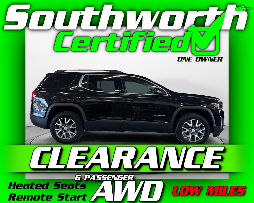 Don't miss this well-equipped 2023 GMC Acadia SLE -- a one-owner, clean CARFAX SUV with the perfect blend of efficiency, space, and safety. Powered by a 2.0L I4 engine and equipped with all-wheel drive, it's ready for daily drives or weekend getaways. Inside, enjoy 7-passenger seating with second-row captain's chairs for added comfort and accessibility. Stay protected with advanced safety features like forward collision alert, lane keep assist, blind zone monitoring, and enjoy the convenience of remote start. This Acadia has been through the Southworth Certified Inspection, received a fresh oil change, and has been professionally detailed. It's road-ready---call us today at 715-568-2180 to schedule your test drive!