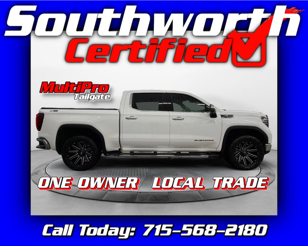 This 2023 GMC Sierra 1500 SLT is a one-owner, local trade powered by the proven 5.3L V8 and equipped with four-wheel drive, making it ready for work or everyday driving. It features Fuel wheels, the versatile MultiPro tailgate, navigation, forward collision alert, and lane keep assist. Comfort and convenience include heated and ventilated leather seats, a heated steering wheel, passive entry, and remote start. It also comes with a spray-in bedliner, bed cover, tow package, and integrated trailer brake controller. This truck has passed a Southworth Certified inspection, received a complete professional detail, and comes with a fresh oil change. Call today to schedule your test drive at 715-568-2180.