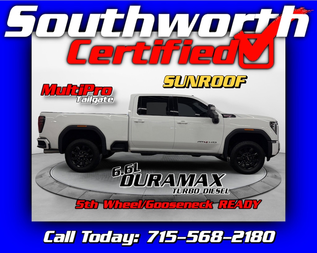 Take a look at this rugged and refined GMC Sierra 2500HD AT4 powered by the legendary 6.6L V8 Duramax turbo diesel and equipped with four-wheel drive, all backed by a clean Carfax and under 29,000 miles. This AT4 blends heavy-duty capability with premium comfort, featuring heated and cooled leather seats, heated steering wheel, navigation, Head-Up Display, sunroof, passive entry, and remote start. Safety and confidence come standard with Forward Collision Alert, Lane Keep Assist, Blind Zone Alert, and Surround Vision cameras. It also includes the versatile MultiPro tailgate for added functionality on the job or at home. This truck has passed a Southworth Certified inspection, received a complete professional detail, and comes with a fresh oil change---ready to go. Call today to schedule your test drive at 715-568-2180!