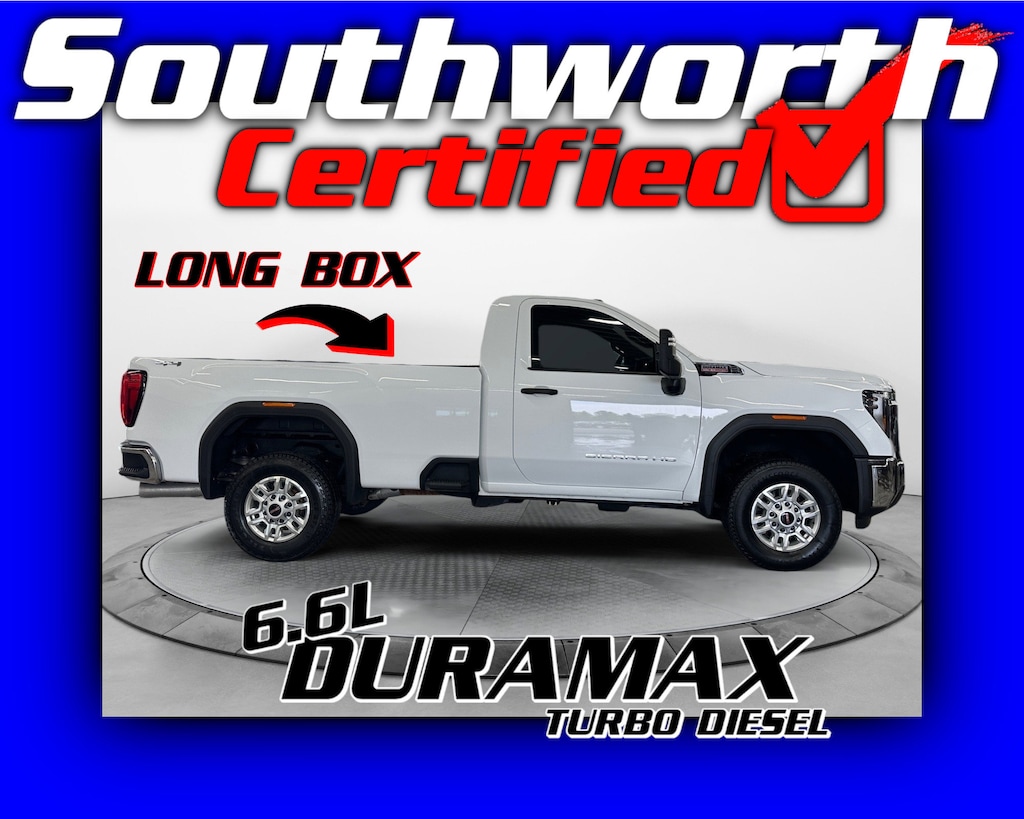 Tackle any job with confidence in this powerful 2024 GMC Sierra 2500HD Pro, equipped with the legendary 6.6L V8 Duramax turbo diesel engine and four-wheel drive. This heavy-duty truck is built for performance and durability, featuring a clean CARFAX and very low miles. It's packed with smart features like the innovative MultiPro tailgate, forward collision alert, lane keep assist, cruise control, and SiriusXM satellite radio. Ready to tow and haul, it comes with a full tow package and integrated trailer brake controller and brand new sprayed in bedliner in the spacious long box. This truck has passed the Southworth Certified Inspection, received a fresh oil change, and has been professionally detailed inside and out. Call us today at 715-568-2180 to schedule your test drive---you won't want to miss it!