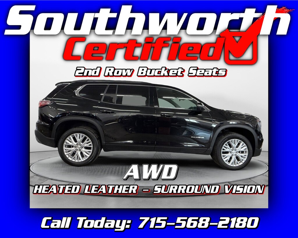 This 2025 GMC Acadia AWD Elevation is a sharp, locally owned SUV with a clean Carfax and just one previous owner. Powered by a 2.5L I4 engine and equipped with all-wheel drive, it delivers confident performance year-round. This 7-passenger Acadia comes loaded with Bose premium sound, remote start, heated seats and heated steering wheel for comfort in any season. Safety is a priority with forward collision alert, adaptive cruise control, and blind zone monitoring. Sitting on 20" premium wheels, it has the style to match its capability. It has completed a Southworth Certified inspection, received a complete professional detail, and comes with a fresh oil change---ready for its next owner. Call today to schedule your test drive at 715-568-2180.