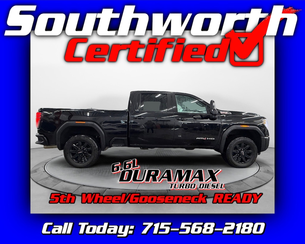 This 2025 GMC Sierra 2500HD AT4 delivers exceptional power and refinement with its 6.6L V8 Duramax turbo diesel and four-wheel drive, making it equally capable on the job site or on the open road. It comes with a clean Carfax and is well equipped with heated and cooled leather seating, Bose premium audio, remote start, a versatile MultiPro tailgate, and a sprayed-in bedliner. Designed for serious towing, it is 5th wheel and gooseneck tow ready, while advanced safety features such as forward collision alert, lane keep assist, and blind zone monitoring add confidence behind the wheel. This Sierra has passed a Southworth Certified Inspection and includes a fresh oil change and complete professional detail, ensuring it is fully serviced and ready to go. Call us today to come see it at 715-568-2180.