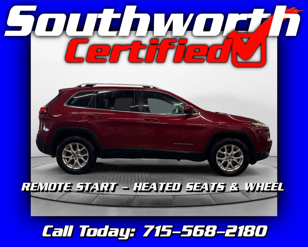 This 2015 Jeep Cherokee Latitude is powered by a reliable 3.2L V6 and equipped with four-wheel drive, making it a great choice for year-round driving. Locally owned and well cared for, it features heated front seats, a heated steering wheel, passive entry, remote start, and a tow package for added versatility. This vehicle has passed our Southworth Certified Inspection and has been fully reconditioned with a fresh oil change and complete professional detail, so it's ready for immediate delivery. Call today to schedule your test drive at 715-568-2180.
