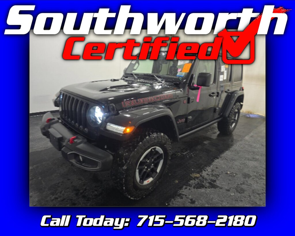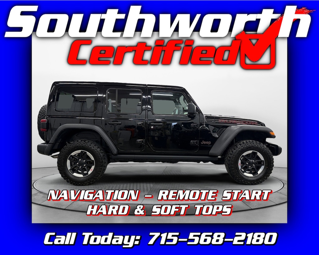 This 2022 Jeep Wrangler Unlimited Rubicon is a well-equipped, adventure-ready SUV powered by a 2.0L I4 turbo engine and proven four-wheel drive, offering both capability and everyday comfort. It features a factory tow package, built-in navigation, an Alpine premium sound system, and seamless smartphone integration with Apple CarPlay and Android Auto. Comfort upgrades include heated front seats, a heated steering wheel, and remote start for year-round convenience. This Wrangler also includes both the soft top and hard top, giving you versatility for every season. With a clean CARFAX, a completed Southworth Certified inspection, a full professional detail, and a fresh oil change, this Rubicon is truly turnkey and ready to enjoy. Call today to schedule your test drive at 715-568-2180.