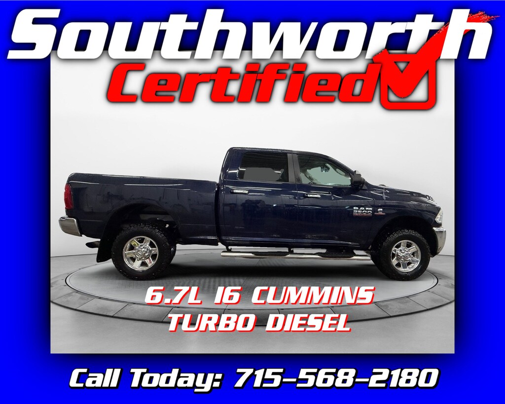 This 2013 Ram 2500 Big Horn is powered by the legendary 6.7L I6 Cummins turbo diesel and equipped with four-wheel drive, making it ready for work or play in any condition. It features a clean Carfax, tow package with integrated trailer brake controller, poly bedliner, remote start, heated seats, and a heated steering wheel for added comfort. This truck has passed a Southworth Certified inspection, has been professionally detailed, and comes with a fresh oil change, so it's fully serviced and ready to go. Call today to schedule your test drive at 715-568-2180.